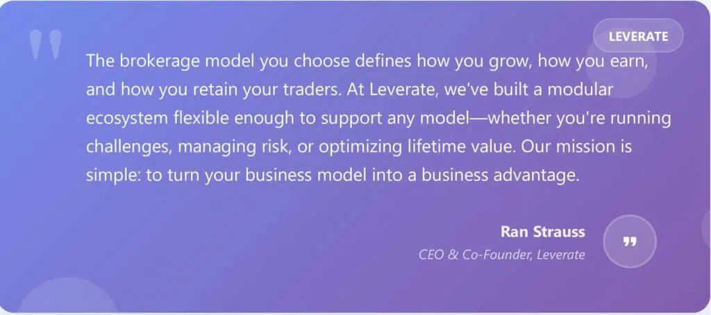 Leverate offers a complete, modular infrastructure to support any regulated brokerage business model, from idea to live launch, with a focus on operational autonomy, revenue growth, and trader retention.