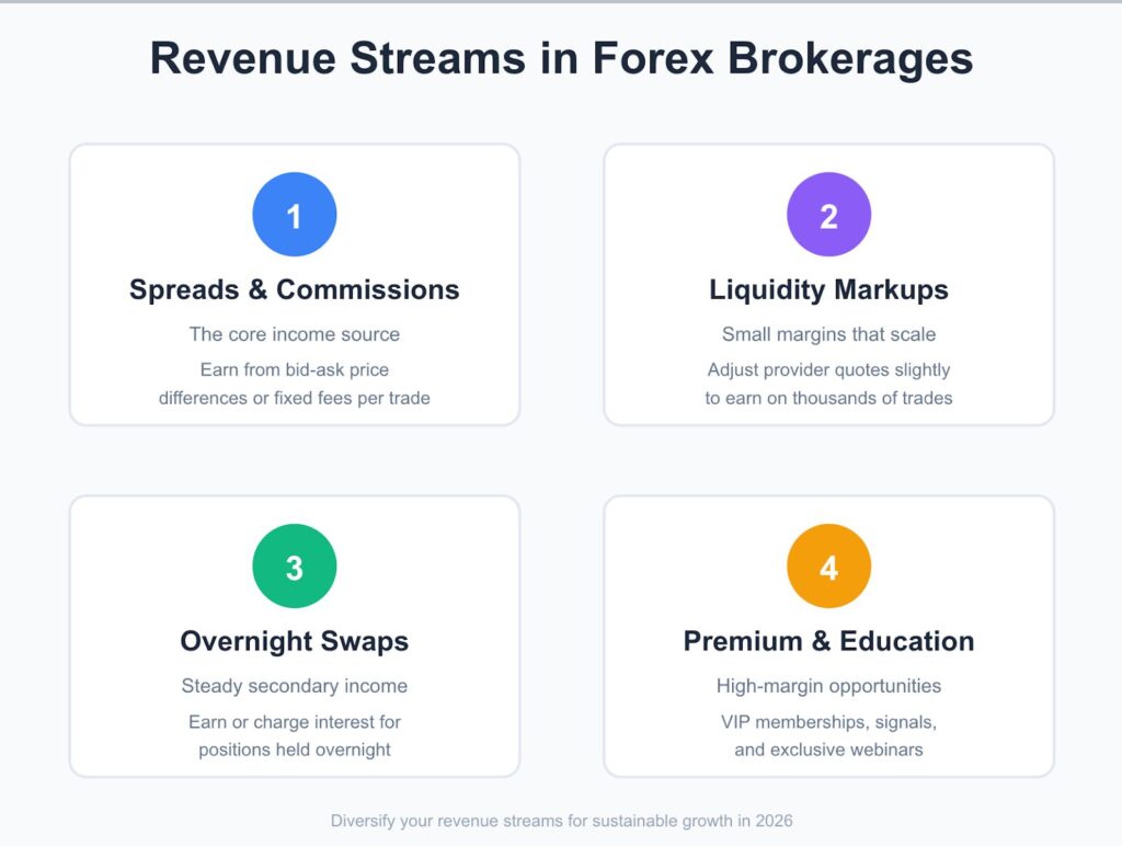 When mapping how to start a forex business, revenue diversification is crucial. A well-designed brokerage earns from multiple streams, not just trades.
