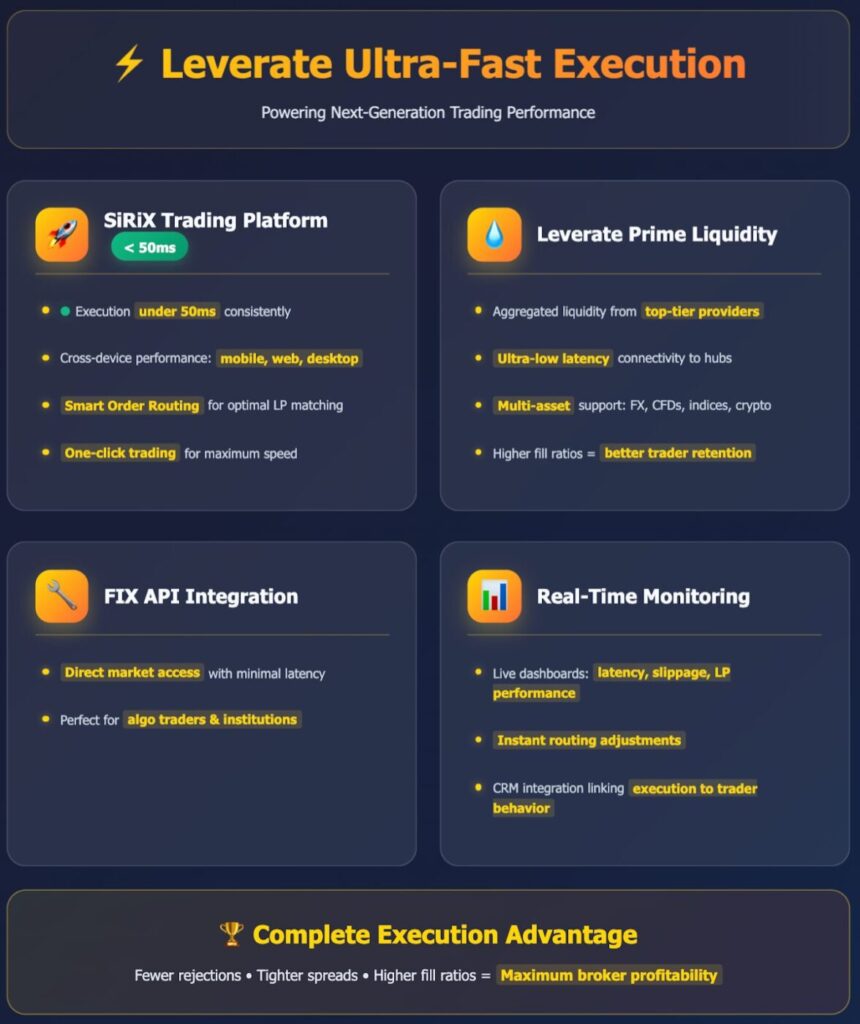 At Leverate, we’ve built our ecosystem around this challenge. Our SiRiX trading platform, combined with Leverate Prime liquidity ensures execution speeds under 50ms, even during high-volatility events. With Smart Order Routing, FIX API integration, and aggregated liquidity pools, brokers can deliver a seamless trading experience that keeps traders engaged and loyal.