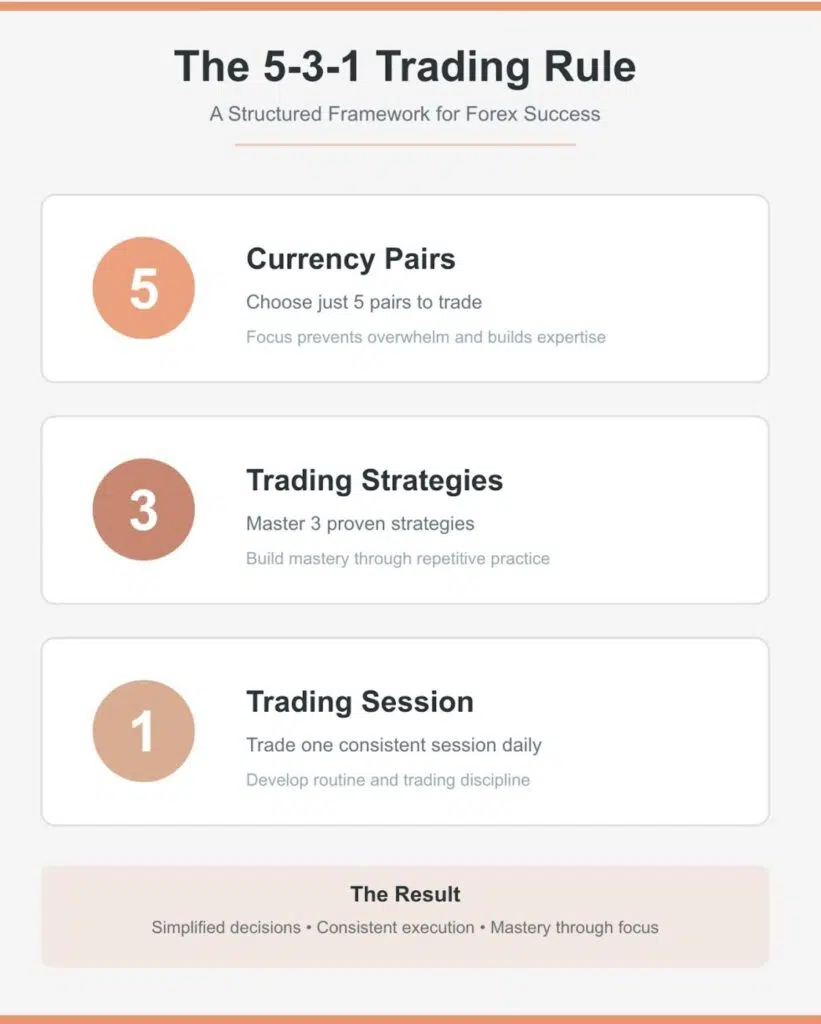 L’un des cadres les plus pratiques de la suite de règles du forex est la règle de trading 5-3-1. Il s’agit d’une approche structurée qui vous aide à simplifier la prise de décision et à discipliner votre processus de trading. La logique est simple :