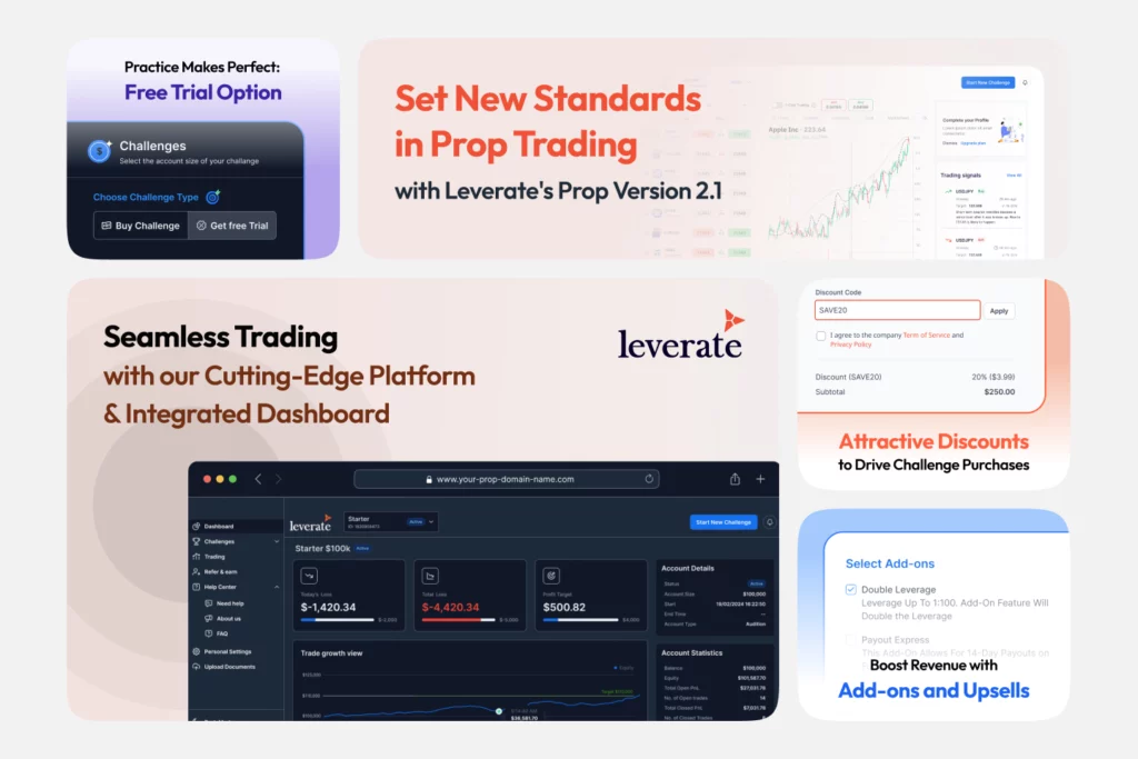 Aumente seu ROI com nossos poderosos add-ons e condições de negociação. Agora você pode oferecer aos seus clientes ”alavancagem dupla”, permitindo que os traders ampliem seus retornos potenciais e atraiam traders mais qualificados. O ”Payout Express” é outra oferta adicional para contas com fundos, garantindo acesso mais rápido aos lucros e aumentando a satisfação e a retenção do trader. O ”Profit Booster” oferece pagamentos mais altos, incentivando os operadores a terem um desempenho melhor e a permanecerem comprometidos. Esses são apenas alguns dos recursos que, em conjunto, aumentam o envolvimento dos traders e a lucratividade das empresas de propulsão.