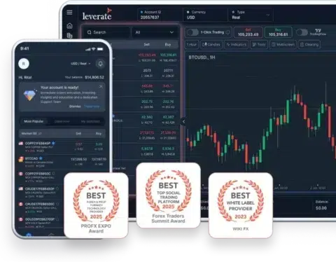 Запустите свою брокерскую компанию с MT5 или MT4. Опирайтесь на проверенную инфраструктуру Leverate.